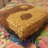 Take the cake out. Apply the stencil. Sprinkle half of the cake with grated nuts and the other half with chocolate, just like in the picture.