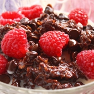 Serve the oatmeal topped with fresh raspberries and chocolate chips.