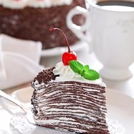 Assemble the cake. Place one pancake on a serving plate, spread a thin layer of frosting, cover with another pancake, and repeat with all pancakes. Frost the top and sides of the cake with the frosting and sprinkle with grated chocolate. Decorate the top of the cake with the remaining frosting using a pastry bag fitted with a star tip, and add cocktail cherries.