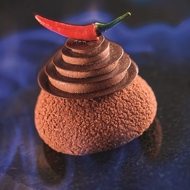 Prepare a whipped ganache with milk chocolate and pepper. Bring the cream to a boil. Pour it over the chocolate and blend with an immersion blender until emulsified. Add pepper to taste and blend again with the immersion blender. Prepare 24 hours before use. Store for up to 72 hours at 39°F. Whip to stiff peaks before decorating.