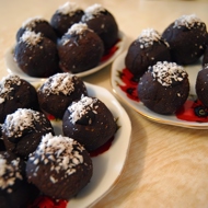 Pour the coating for the cakes onto a plate. Remove the mixture from the refrigerator. Roll the cakes in your palms. Coat the formed cakes in the topping and place them on parchment paper on a baking sheet or tray. Decorate with white cream or nuts.