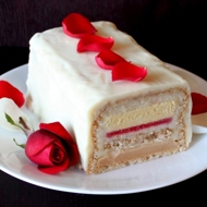 Remove the Christmas log from the mold, transfer it to a metal rack. Pour the glaze evenly over it, allowing it to spread on its own. Wait for the glaze to set (since the log is cold, this will happen in a few minutes), then use a sharp knife, moistened in hot water and dried, to trim the edges of the log from both ends. Transfer to a serving plate and decorate with rose petals.