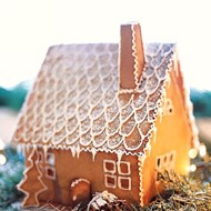 Brush the edges of the house's gable with caramel syrup and immediately attach the roof (be careful to align the roof evenly and centrally).