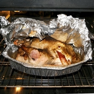 Wrap the turkey in foil and bake for 3.5 to 4 hours, until the internal temperature of the turkey reaches 176°F. About 45 minutes or slightly less before the dish is done, remove the foil and allow the turkey to brown.