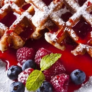 Bake the waffles in a waffle maker until golden brown. To make the sauce, thaw the raspberries, mix with powdered sugar, and strain.