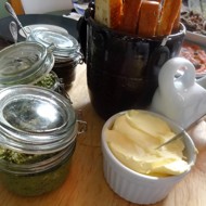 On a rotating platter in authentic jars, place the 3 sauces, add the ciabatta, butter, and in a sauceboat, put good olive oil with balsamic (3:1).