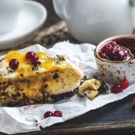 Place the cheesecake onto dessert plates and drizzle with orange sauce (15 grams per serving). Next to it, serve the flambeed berries in a sauce boat (40 grams per serving).