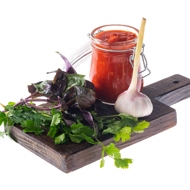 Recipe from a popular American restaurant. Classic adjika is not just a spicy sauce for meat; it's a fragrant dip that's perfect for bread, and it can bring a taste of Georgia to any dish. It's also a way to capture all the colors and flavors of summer in one jar: the tangy and juicy tomato, the bold basil and garlic, and the refreshing bell pepper.