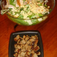 Place the chicken on the salad leaves, drizzle with the sauce, and mix in the croutons along with thinly sliced Parmesan.
