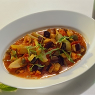 Then add the tomatoes, vinegar, and capers. Cover and simmer for another 12 minutes, until the eggplants and onion are tender. Season with salt and pepper and add the chopped basil.