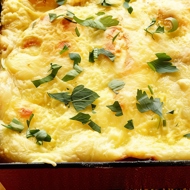 As soon as the cheese soufflé develops a golden crust, it should be taken out and served immediately with warm French baguette.