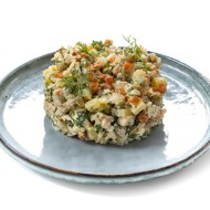 In a large bowl, combine the chicken, all the prepared vegetables, peas, chopped herbs, and eggs. In this form, the salad can be stored in the refrigerator for up to 3 days.