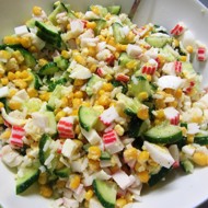 Remove the crab sticks from the package and take off the individual plastic wrapping. Cut the crab sticks into small cubes. Peel the eggs and also chop them into small cubes. Dice the cucumbers into cubes as well.