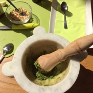 Place the garlic in a bowl along with a few grains of salt and mash it with a pestle. Add the pine nuts and blend again.