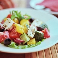 In a large bowl, combine the chopped tomatoes cut into small wedges, the cucumber sliced into half-moon pieces, the red onion sliced into thin rings, the green bell pepper cut into thin strips, diced feta cheese, and olives.