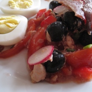 In the traditional version of the classic Niçoise salad, neither lettuce nor boiled vegetables nor vinegar are used. And remember, a resident of Nice would never think to make a salad with fresh tuna. This dish is based on canned tuna. If the olives are canned, it is advisable to place the olives without brine in a separate container in advance, and drizzle them with a mixture of olive oil, 1 tablespoon of lemon juice, and a pinch of herbes de Provence.