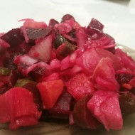 Boil the beetroot, carrot, and potato until cooked. It is preferable to boil the beetroot separately from the potato and carrot to prevent discoloration of the vegetables. Check the readiness of the vegetables by piercing them with the tip of a knife. Peel and finely chop the onion.
