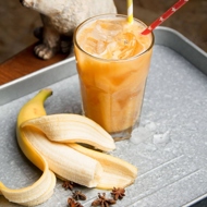 Blend half of a banana and add it to the smoothie. Pour in the banana syrup.