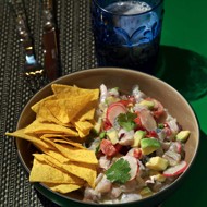 Add diced avocado and tomatoes, finely chopped onion, cilantro leaves, thin slices of radish, and pomegranate seeds to the chilled marinated fish.