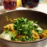 Turn off the rice, let it steam to the desired consistency, fluff it up, and serve on plates, topping with the finished curry sauce with chicken and sprinkling with finely chopped fresh cilantro.