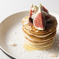 Place a stack of pancakes on a plate, drizzle with syrup, sprinkle with shredded coconut, and garnish with figs.