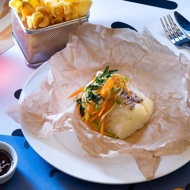 Place the cod on parchment paper, pour the marinade with vegetables over it, add herbs, and fold the parchment into an envelope. Send it to the oven preheated to 356°F for 7–10 minutes.