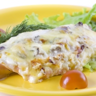 Grate the cheese and mix it with the breadcrumbs. Drizzle the fish with sauce and sprinkle with the cheese and breadcrumbs. Bake in the oven at 392°F until a golden crust forms.