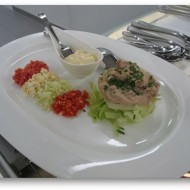 On a serving plate, place the lettuce, then top with the cod liver, and drizzle with olive oil. Serve the chopped vegetables and the chicken egg alongside. Serve the mayonnaise separately. Garnish with chives.