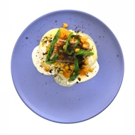 Pour 200 ml of milk over the garlic and boil for 10 minutes, then drain the milk and rinse the garlic. Pour in the milk again and boil for another 10 minutes. Repeat this process one more time. Then rinse the garlic again, pour in 300 ml of milk, and bring to a boil. Transfer the garlic and milk mixture to a blender, add a clove of black garlic and the zest of a salted lemon, then blend until smooth. Pour the blended sauce into a saucepan, heat it up, and add 30 ml of cream.