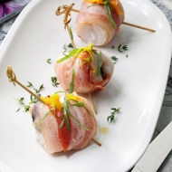 Cod with prunes wrapped in bacon