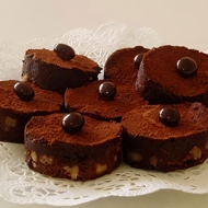 Cool, slice, dust with cocoa powder, and garnish with a coffee bean.