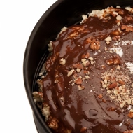 After 1.5 to 2.5 hours, the mixture should be fully set. Dip the mold in hot water, cut the edges of the mixture with a thin knife, and flip the cake onto a suitably sized plate. Pour melted milk chocolate over the top of the cake.