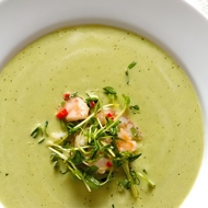 Chill the soup. Garnish with shrimp and herbs, and serve.