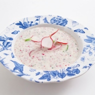 Wash the cucumbers, remove the seeds, and cut them into large pieces. Cut the radishes into similar large pieces. Transfer the vegetables to a blender, add the vinegar, cold milk, sugar, a pinch of salt, and red pepper, and blend everything until smooth to create a pureed soup.