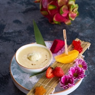 To prepare the cold soup, mix the coconut milk, sugar syrup, and mango syrup.