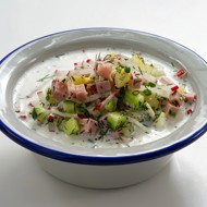 Serve the okroshka cold with mineral water and kefir. The unmixed dry and liquid components can be stored in the refrigerator for up to 2 days.