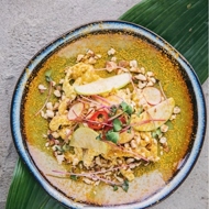 This salad is inspired by the famous British dish — coronation chicken. It features marinated chicken in a spicy sauce with Indian spices (curry, cardamom) and mango chutney. The bistro version contains the same flavors and ingredients: mango, ginger, as well as red onion and raisins. The dressing is a blend of aioli, Worcestershire sauce, and of course, curry.