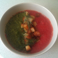 Serve in a bowl, alternating between the tomato and cucumber mixtures, and garnish with herbs and croutons.