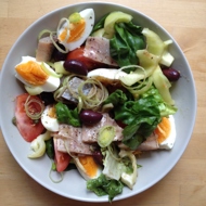 Dress the salad with oil and vinegar, mix, and place boiled eggs cut into quarters on top. Season with salt and pepper.