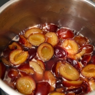 Add the pitted and washed plums to the boiling compote, bring it back to a boil, and then cool.