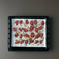 Preheat the oven to 212°F. Arrange the tomato wedges on a baking sheet with the cut side facing down. Place slightly crushed garlic cloves between the wedges. Sprinkle with herbes de Provence. Bake in the oven for about three to four hours.