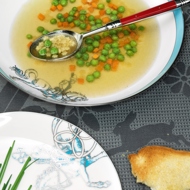 Consommé with Star-Shaped Noodles, Carrots, and Peas
