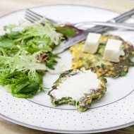 Stack the fritters and serve topped with cubes of cream cheese. Alternatively, spread the soft cheese directly on the fritters. Serve with a salad of arugula, spinach, curly endive, lettuce, romaine, and various other delicious and healthy greens you find in the fridge.