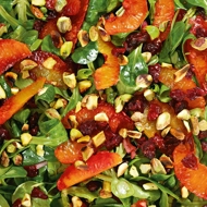 Corn salad with blood oranges, pistachios, and pomegranate.