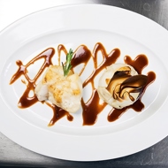 Pour the demi-glace beautifully onto a large plate — this is a heavily reduced beef broth with tomato, but it takes a whole day to prepare, so it's easier to buy this sauce. Arrange the risotto on the plate, with the monkfish placed slightly apart. You can cut the fish into two pieces for easier eating. Garnish the rice with a sprig of rosemary.
