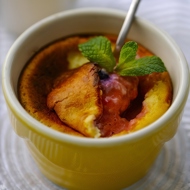 Grease the bottom of the baking molds with butter, place the berries, lightly sprinkle with sugar, and pour the batter up to 2/3 of the height of the mold (the casserole will rise).