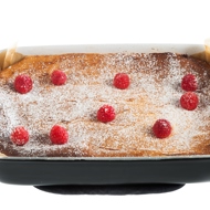 Dust the finished casserole with powdered sugar and garnish with fresh raspberries.
