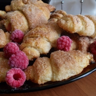 Cut each circle from the center into 6–12 wedges (like a pizza). Place 1–2 raspberries on the wide end of each wedge, and carefully roll from that edge towards the inner corner.