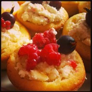 Cool for 1–2 minutes, then cut off the top of the muffin for the cottage cheese filling. Cut carefully, avoiding damage to the edges. Mix the cut-off part in one bowl with the cottage cheese and cream, adding a couple of berries for color variation in the filling. Carefully place the filling, decorating with berries.