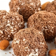 Wet your hands with water, place a tablespoon of the cottage cheese mixture in your palm. Form a flat patty, place half a date inside. Wrap the cottage cheese mixture into a ball and roll it in the chocolate shavings.
